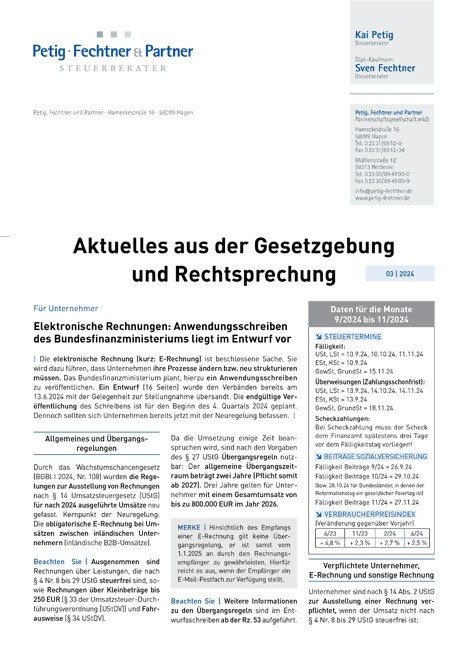 | Die elektronische Rechnung (kurz: E-Rechnung) ist beschlossene Sache. Sie wird dazu führen, dass Unternehmen ihre Prozesse ändern bzw. neu strukturieren müssen. Das Bundesfinanzministerium plant, hierzu ein Anwendungsschreiben zu veröffentlichen. Ein Entwurf (16 Seiten) wurde den Verbänden bereits am 13.6.2024 mit der Gelegenheit zur Stellungnahme übersandt. Die endgültige Veröffentlichung des Schreibens ist für den Beginn des 4. Quartals 2024 geplant. Dennoch sollten sich Unternehmen bereits jetzt mit der Neuregelung befassen. |